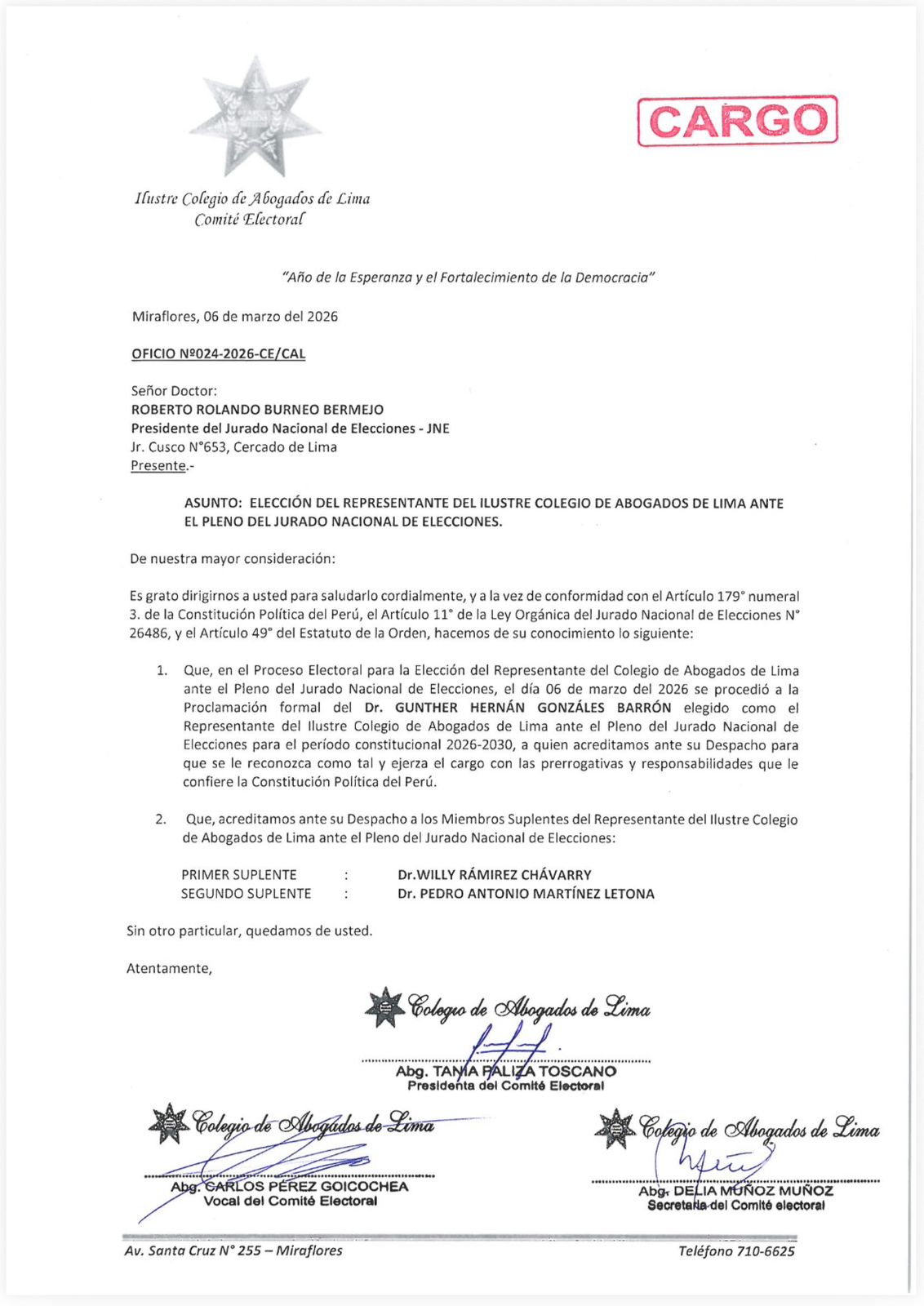 El oficio fue suscrito por los integrantes del Comité Electoral del Colegio de Abogados de Lima, encabezado por su presidenta, la abogada Tanya Paliza Toscano, junto con los miembros Carlos Pérez Goicochea y Delia Muñoz Muñoz, quienes certificaron la proclamación y su comunicación oficial al Jurado Nacional de Elecciones.