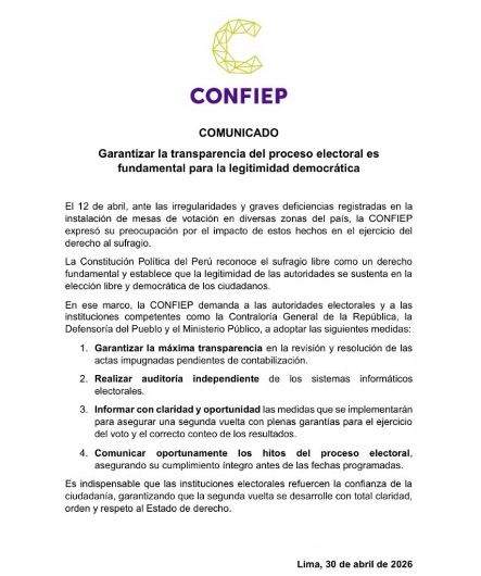 A través de un comunicado, la Confiep pidió a entidades como la Contraloría General de la República, la Defensoría del Pueblo y el Ministerio Público que se garantice la máxima transparencia en la revisión de las actas impugnadas que aún están pendientes de contabilización. El objetivo, según indicaron, es asegurar que los resultados reflejen fielmente la voluntad ciudadana.
