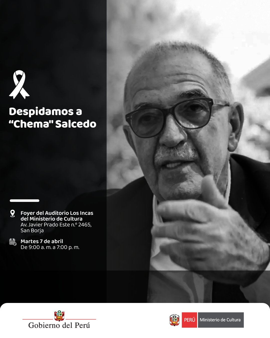 El Ministerio de Cultura anunció una ceremonia pública para despedir al reconocido periodista José María Salcedo de la Torre, quien falleció la madrugada del lunes 6 de abril a los 79 años. La institución convocó a la ciudadanía a participar en este último adiós, destacando su importancia en el ámbito cultural y comunicacional del país.