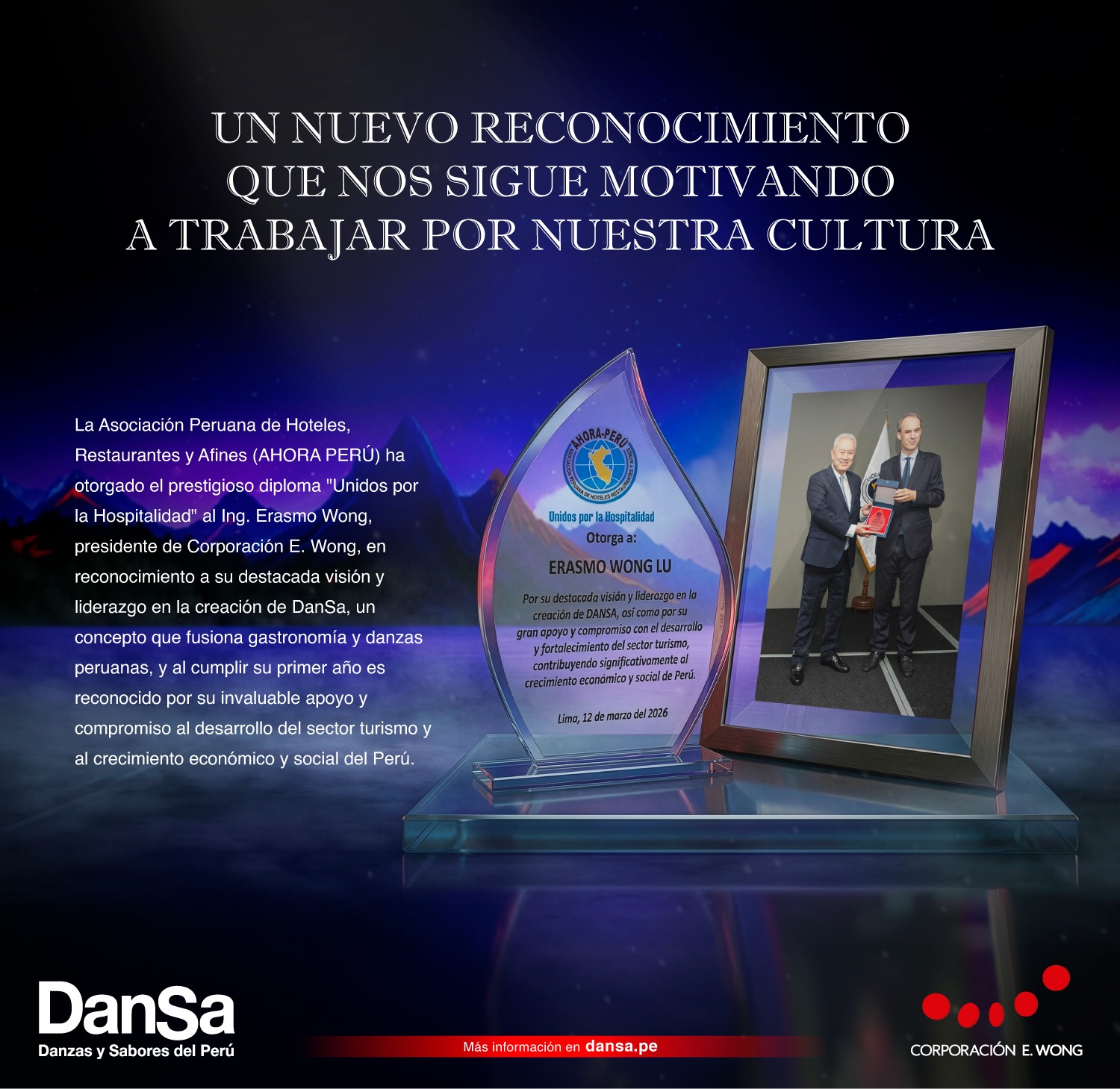 La Asociación Peruana de Hoteles, Restaurantes y Afines (Ahora Perú) otorgó el diploma “Unidos por la Hospitalidad” al empresario Erasmo Wong Lu, presidente de Corporación E. Wong, en reconocimiento a su liderazgo en la creación de DanSa, una propuesta que integra gastronomía y danzas del Perú. El reconocimiento se da en el marco del primer aniversario de este proyecto cultural y gastronómico.