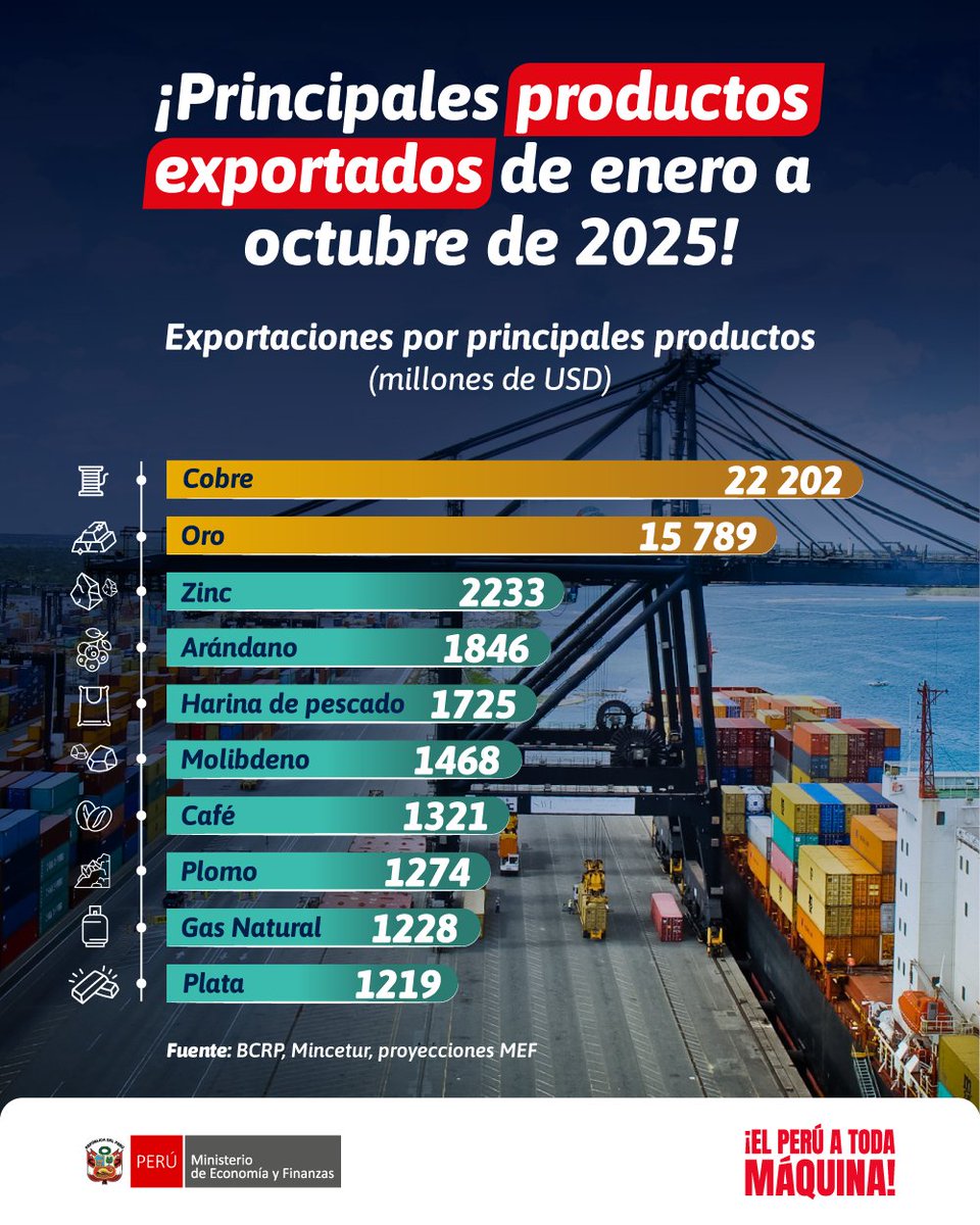 El Ministerio de Economía y Finanzas informó que entre enero y octubre de 2025 el cobre y el oro se consolidaron como los principales productos de exportación del Perú, encabezando el valor total de la canasta exportadora nacional y reafirmando el peso del sector minero en el comercio exterior del país.