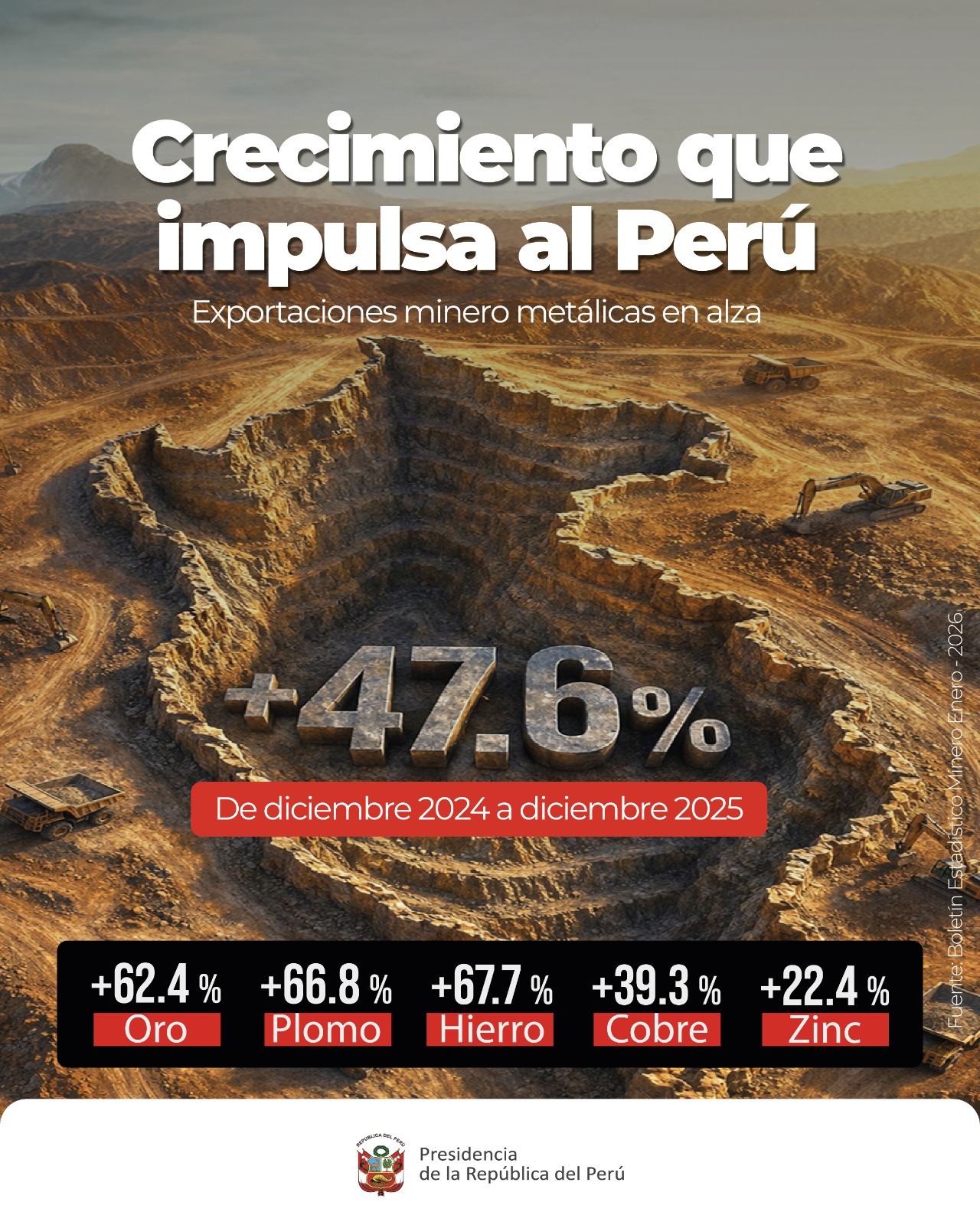 Según el más reciente Boletín Estadístico Minero del Ministerio de Energía y Minas (MINEM), en diciembre de ese año los envíos al exterior alcanzaron los US$ 6,468 millones, cifra que representa un incremento de 47.6% en comparación con el mismo mes de 2024.