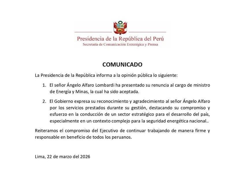 El ahora exministro de Energía y Minas, Ángelo Alfaro Lombardi, presentó su renuncia al cargo, la cual fue aceptada por la Presidencia de la República, según informó el Ejecutivo mediante un breve comunicado. La salida del funcionario ocurre en un contexto de cuestionamientos públicos surgidos en los últimos días.