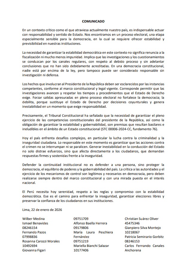 Finalmente, los firmantes advierten que el país enfrenta desafíos urgentes como la criminalidad y la inseguridad ciudadana, por lo que consideran prioritario evitar interrupciones en la conducción del Estado. En ese sentido, recalcan que defender la continuidad institucional no equivale a respaldar a una persona, sino a proteger la democracia, el equilibrio de poderes y la gobernabilidad.