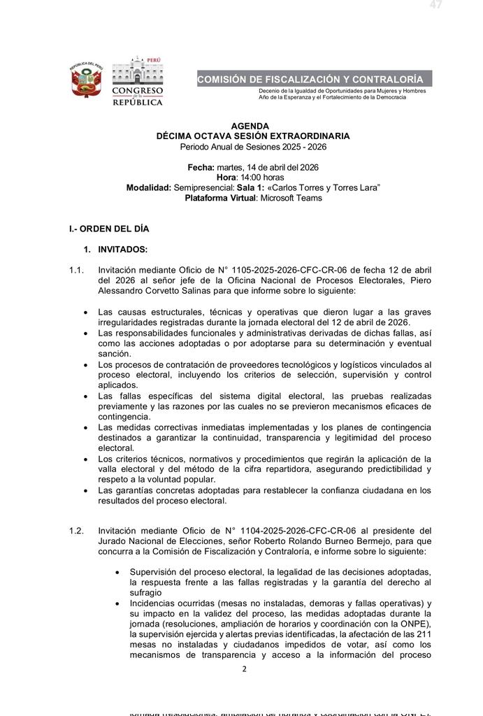 El grupo de trabajo parlamentario, presidido por Elvis Vergara Mendoza, también citó al contralor general César Aguilar Surichaqui y al defensor del pueblo Josué Gutiérrez Cóndor, con el objetivo de que expongan las acciones de fiscalización y las medidas adoptadas para garantizar el respeto del derecho al sufragio. Además, se anunció que serán convocados el secretario general, el jefe de Abastecimiento y otros funcionarios de la ONPE para que expliquen la contratación de proveedores vinculados al proceso electoral.