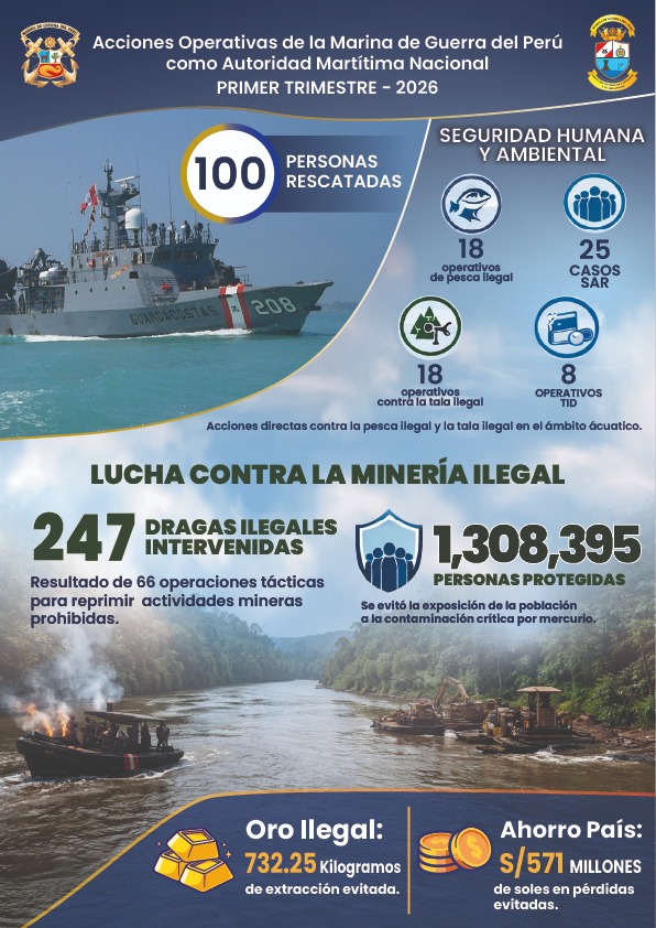 La Marina de Guerra del Perú dio a conocer el balance de sus acciones operativas durante el primer trimestre de 2026, en su rol como Autoridad Marítima Nacional, destacando el trabajo sostenido de su personal en la vigilancia y control del ámbito acuático a nivel nacional. Según la institución, estas intervenciones reflejan un esfuerzo permanente por garantizar la seguridad, el orden y la protección de la población.