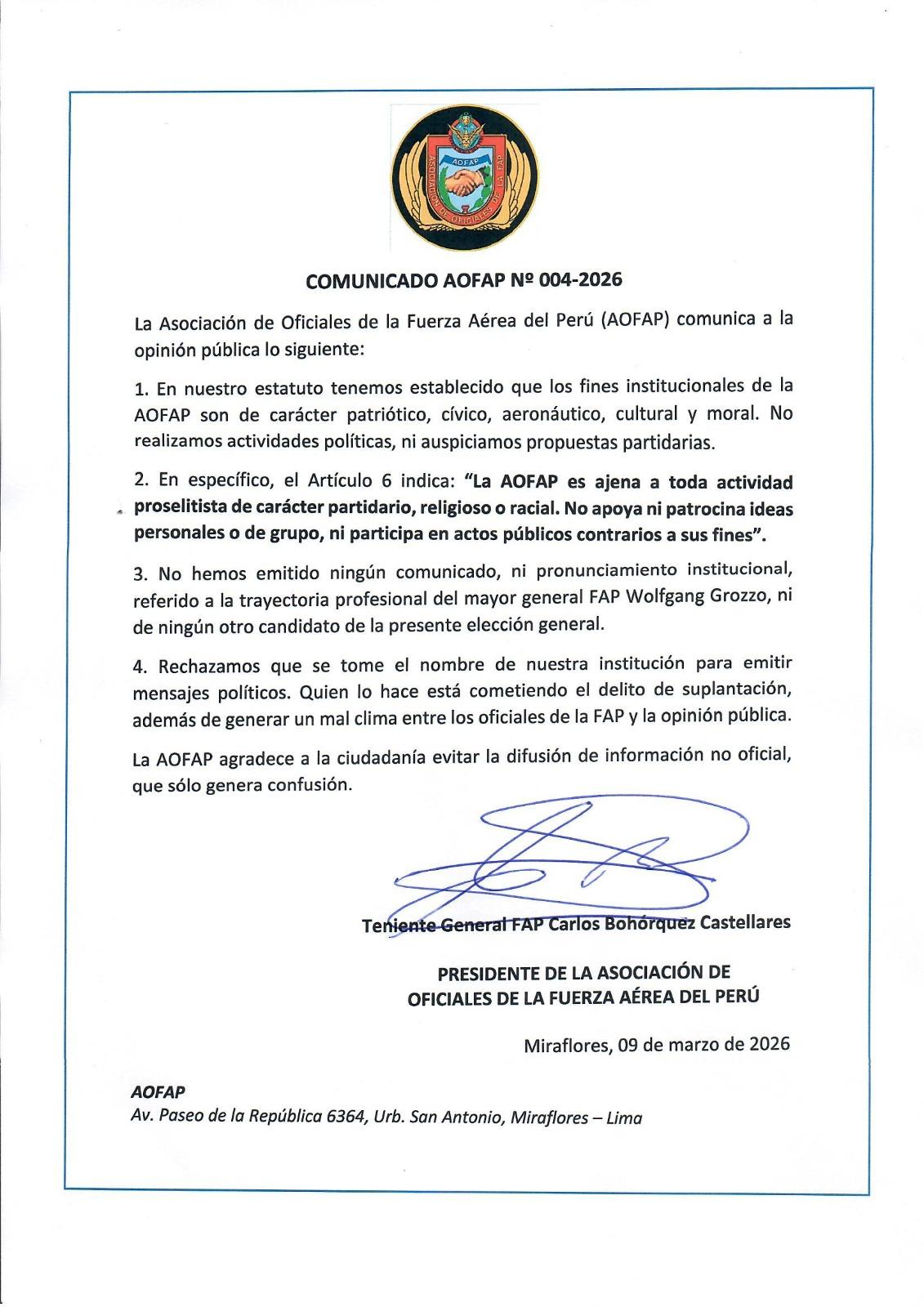 La Asociación de Oficiales en Retiro de la Fuerza Aérea del Perú (AOFAP) desmintió la autenticidad de un comunicado difundido en redes sociales que contenía acusaciones contra el candidato presidencial Wolfgang Grozo Costa. El documento utilizaba el nombre de la organización y, según sus directivos, buscaba afectar la imagen del postulante en medio del actual escenario electoral.
